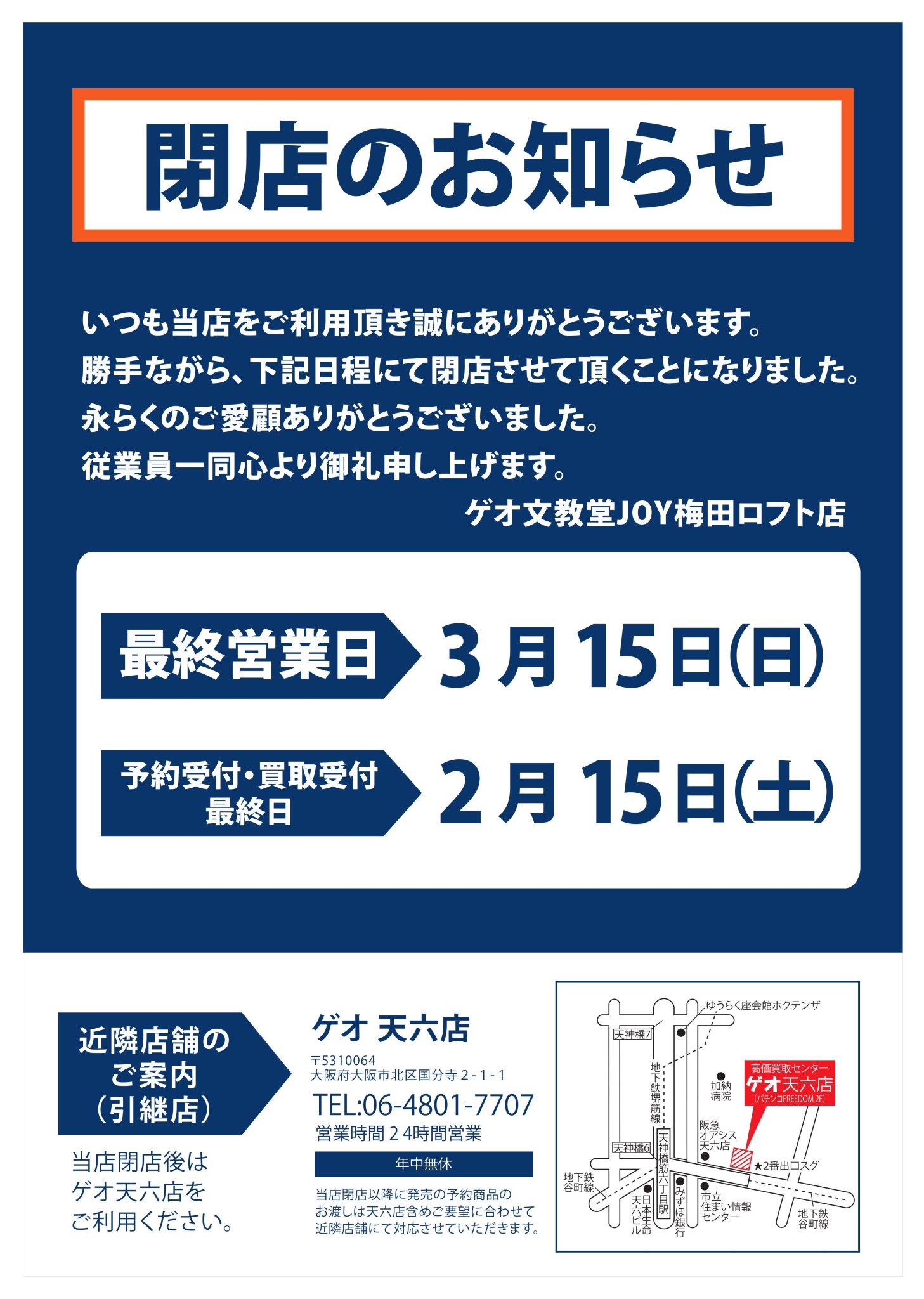 アニメガ ソフマップ なんば店 重要なお知らせ 2 2 つきましてはゲオ文教堂joy梅田ロフト店も閉店となります 最終営業日は 年3月15日 日 となりますが 商品買取最終日は本日 年2月15日 土 となります ご注意ください